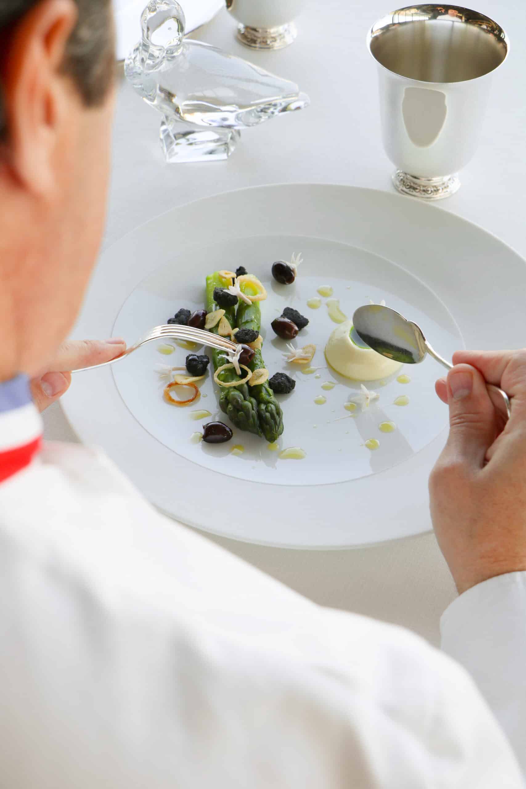 Création Les asperges vertes du printemps s’invitent à la Tour ! Pour fêter le retour des beaux jours, notre Chef Yannick Franques signe une nouvelle recette de saison : asperges vertes étuvées, sauce Toum à l’ail des ours et crumble d’olives Taggiasche.