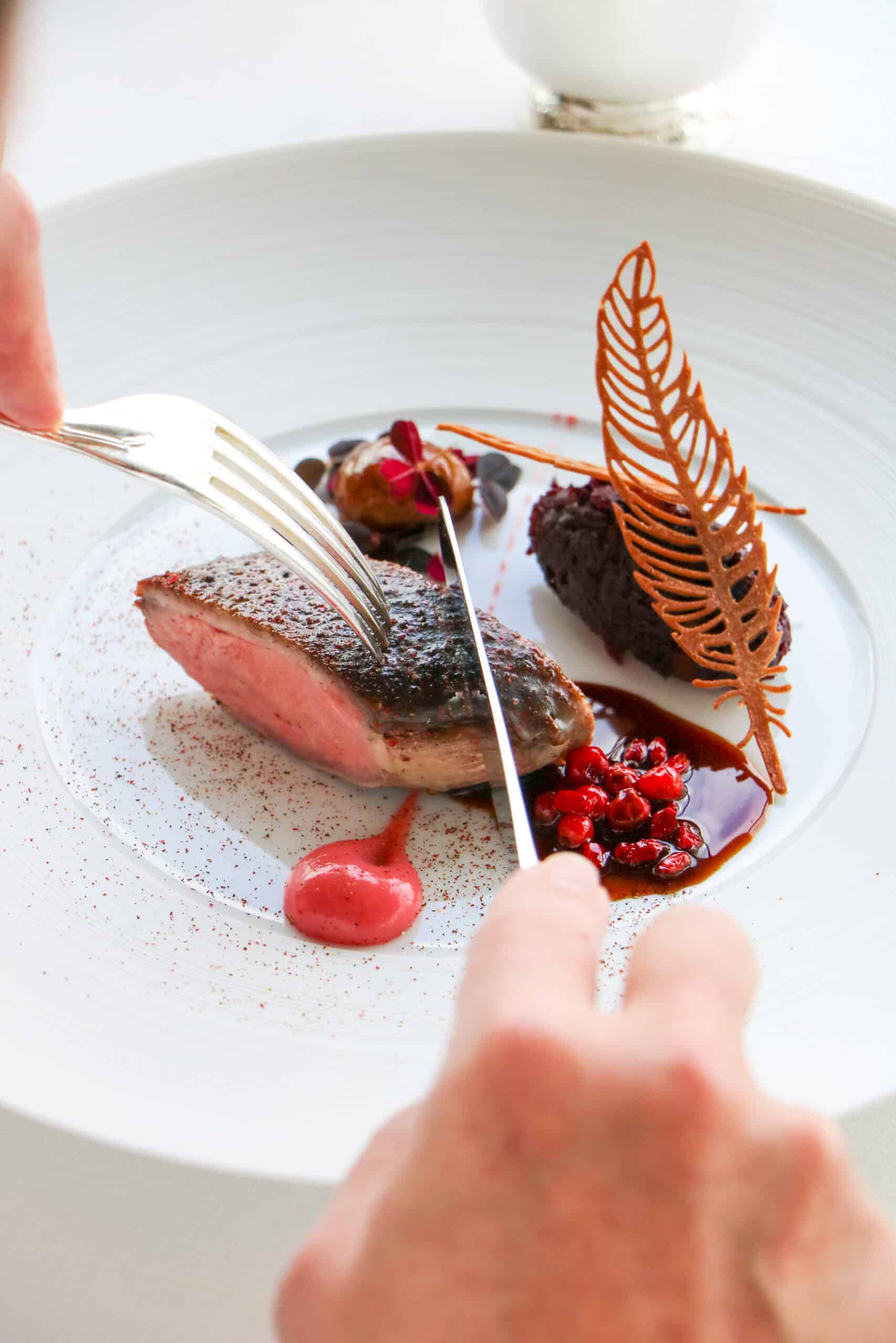 Création Recette : Le Canard au Fil du Temps Le Chef Yannick Franques réinvente « Le Canard au fil du temps », une recette qui évolue au rythme des saisons. Pour ce début d’année, le suprême de canard au poivre d’Assam s’accompagne d’un confit de choux rouges et châtaignes, relevé par une sauce Grand Veneur. Une harmonie parfaite pour sublimer les saveurs hivernales.