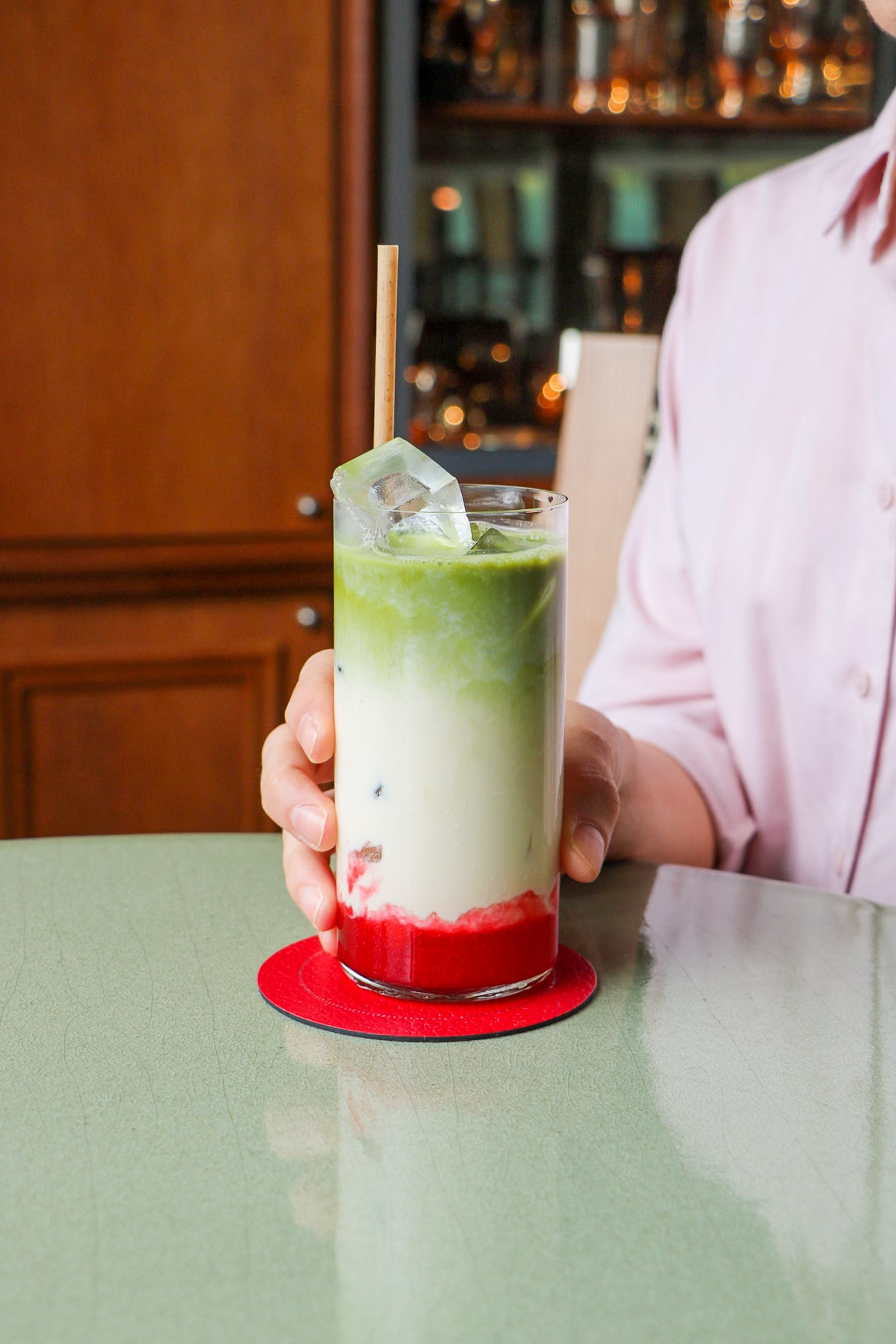 Dans l’écrin feutré du Bar des Maillets d’Argent, notre barista signe une nouvelle création inédite : un matcha latte glacé à la framboise et au citron vert, à savourer tout au long de la journée.