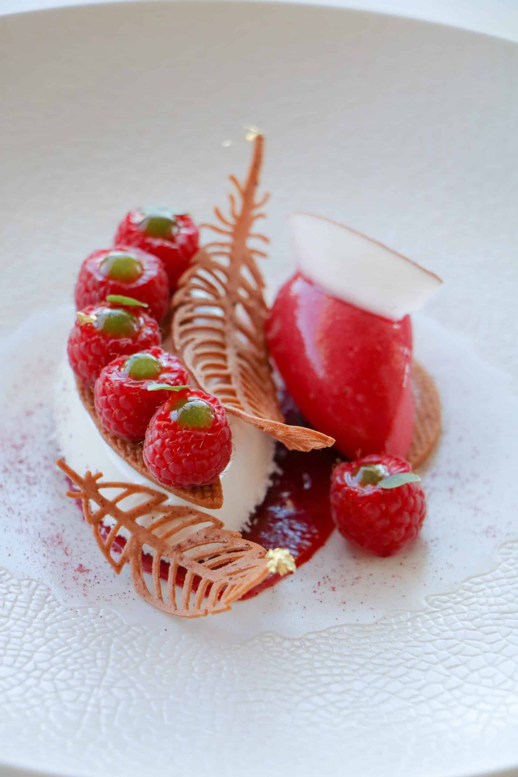 Ce dessert met à l’honneur la framboise dans toutes ses nuances, avec une mousse légère à la noix de coco torréfiée, un sorbet acidulé, des framboises fraîches de variété Tulameen et une pointe de basilic pour la fraîcheur.