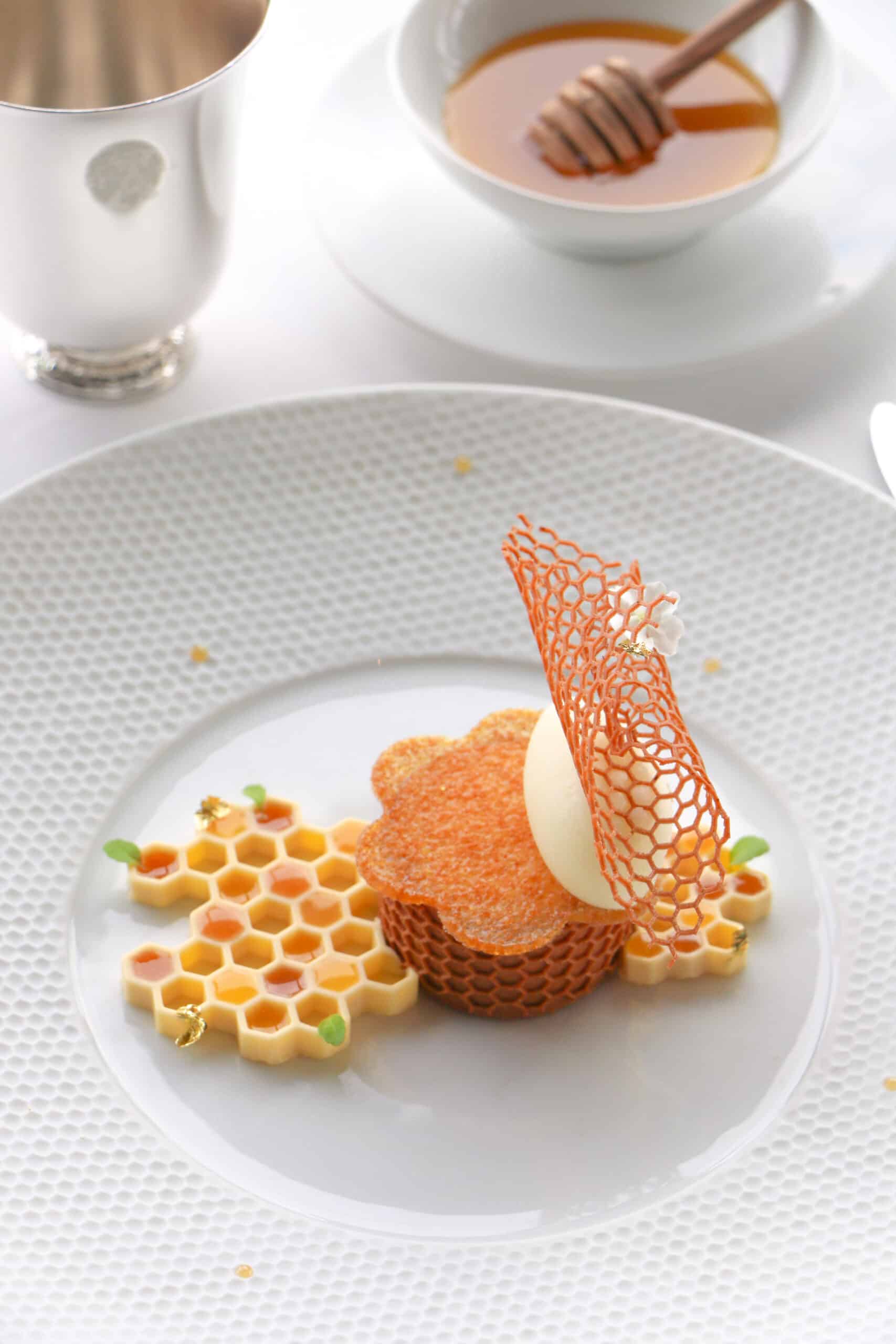 Ce dessert met à l’honneur le miel de tournesol récolté aux abords de la forêt de Fontainebleau par la famille Hamette, apiculteurs depuis cinq générations. Il associe une mousse légère au miel, une marmelade aux zestes de citron et un sorbet rafraîchissant pour une harmonie parfaite de douceur et de vivacité.