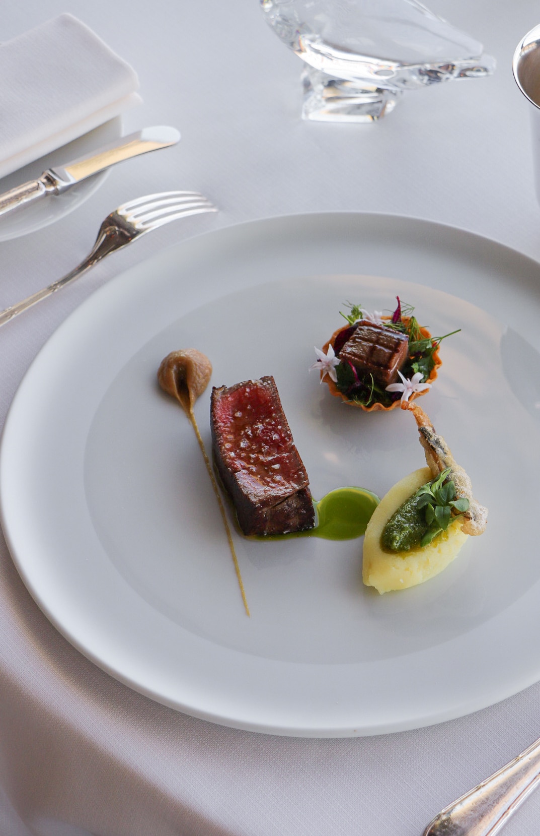 The filet is delicately rubbed with Phu Quoc pepper, served with grilled smoked tongue pastrami, a potato mousseline with pistou, and a crispy anchovy fritter.