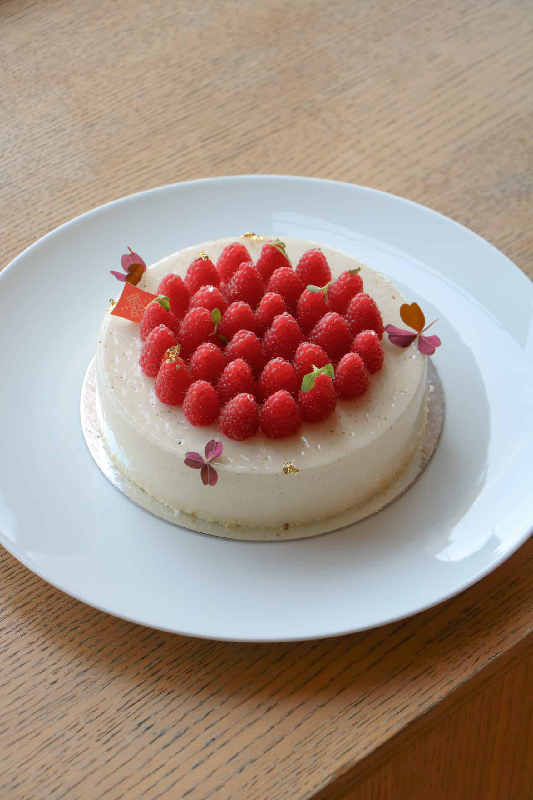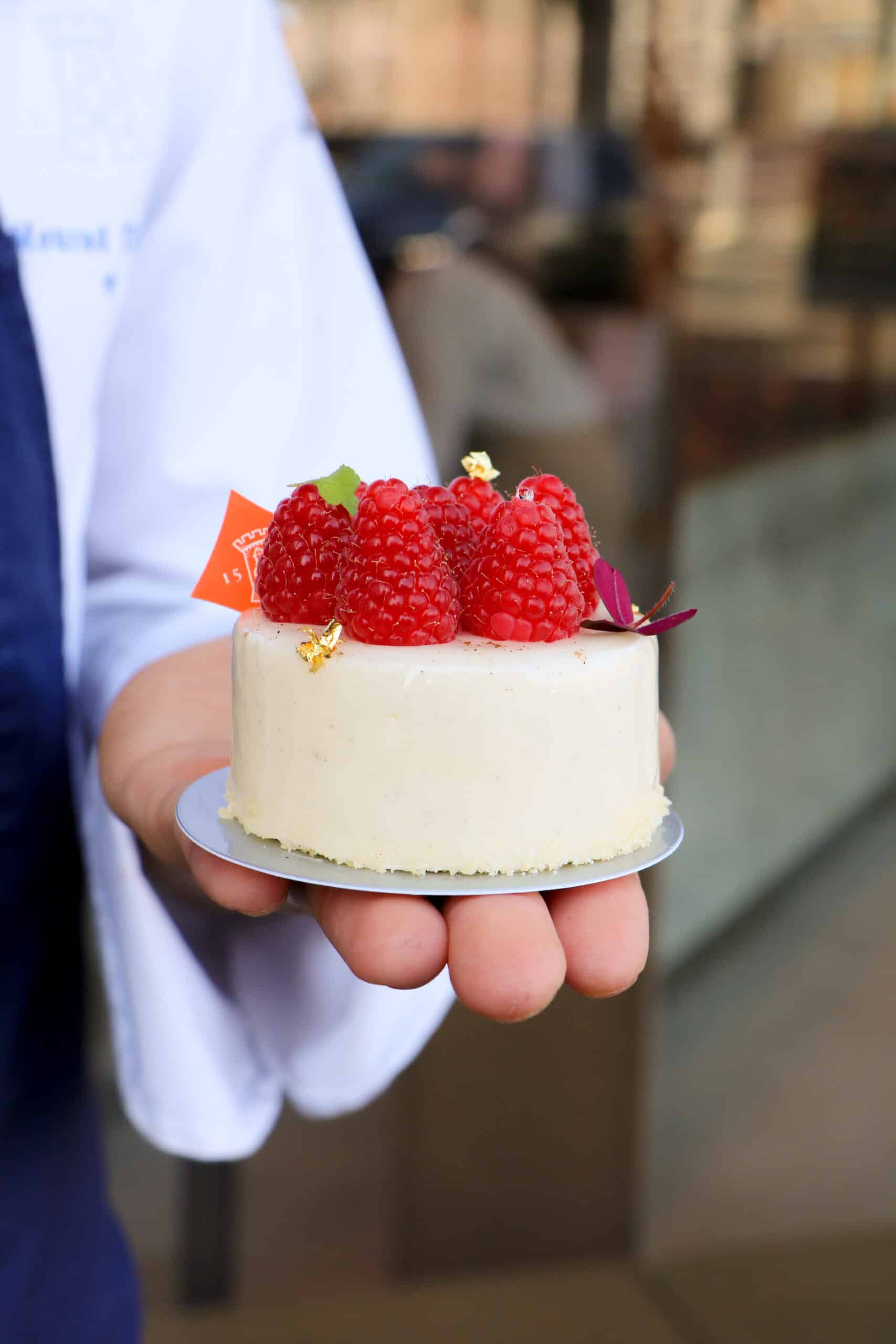Beneath its delicate appearance, this dessert reveals a perfectly orchestrated interplay of textures and flavors. It begins with a tender vanilla sponge made with brown vergeoise sugar — soft and fragrant. Then comes a crisp almond layer, adding a subtle crunch. At its heart lies a raspberrylime compote, balancing the sweetness of a light mousse infused with organic Madagascan vanilla.