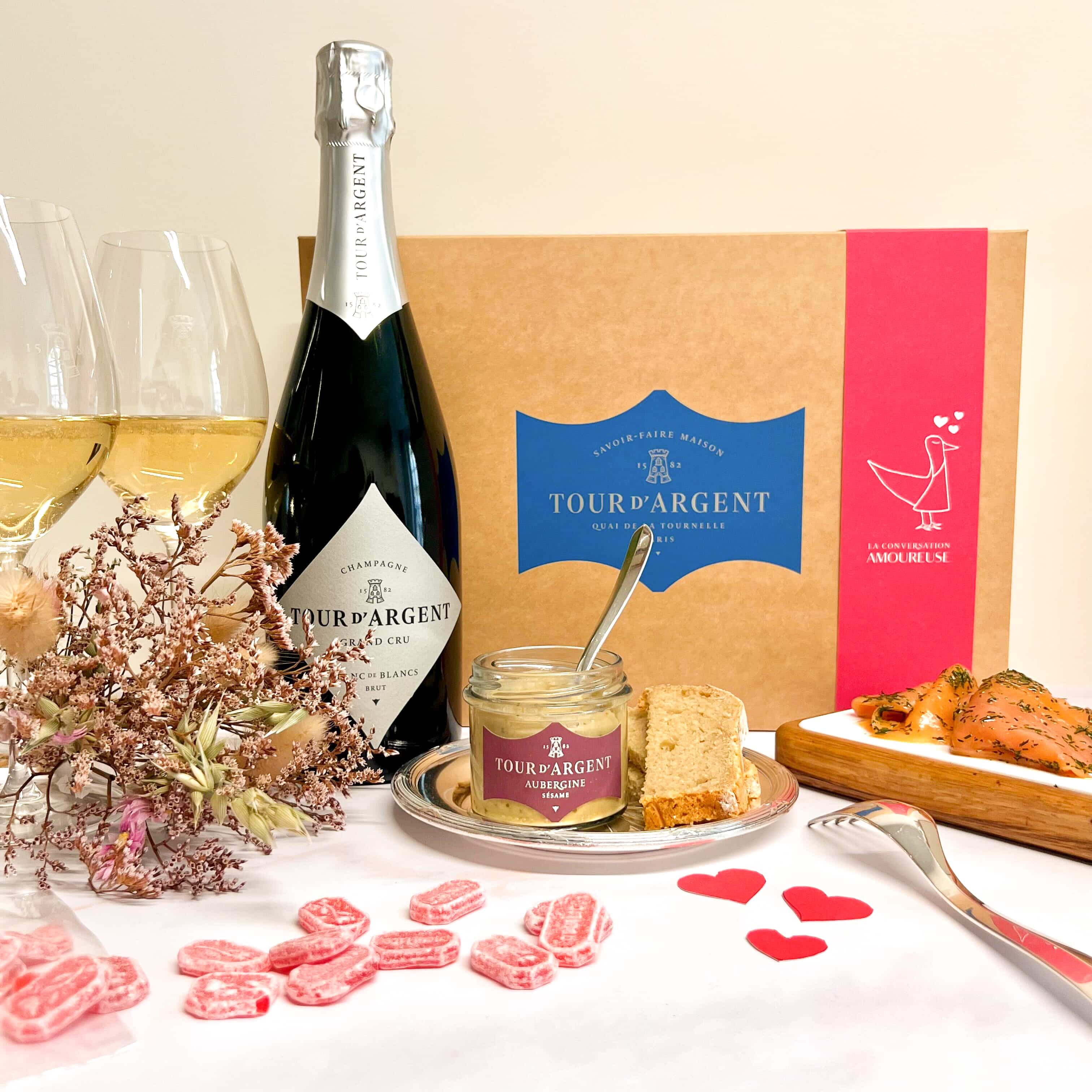 Création Célébrez la fête des amoureux en tête à tête à la maison ! Pour vous offrir une expérience Tour d’Argent à la maison, l’Épicerie Tour d’Argent dévoile sa Conversation Amoureuse, un coffret gourmand autour d’une bouteille de champagne Grand Cru Tour d’Argent Blanc de Blanc et une sélection de produits salés et sucrés des plus grands artisans français.