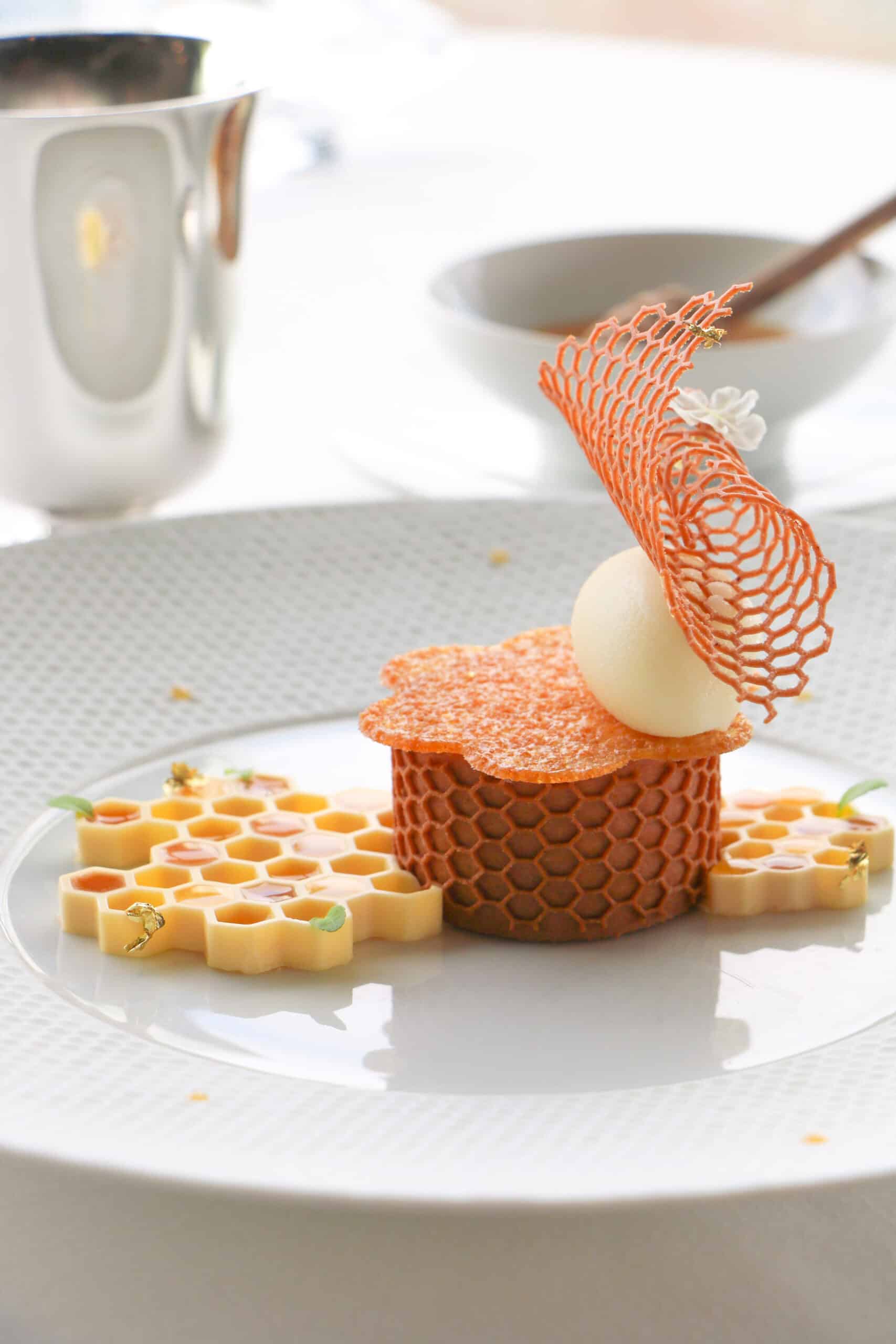 This dessert highlights sunflower honey harvested near the Fontainebleau forest by the Hamette family, beekeepers for five generations. It combines a light honey mousse, a candied lemon zest marmalade, and a refreshing sorbet, creating the perfect balance of sweetness and freshness.