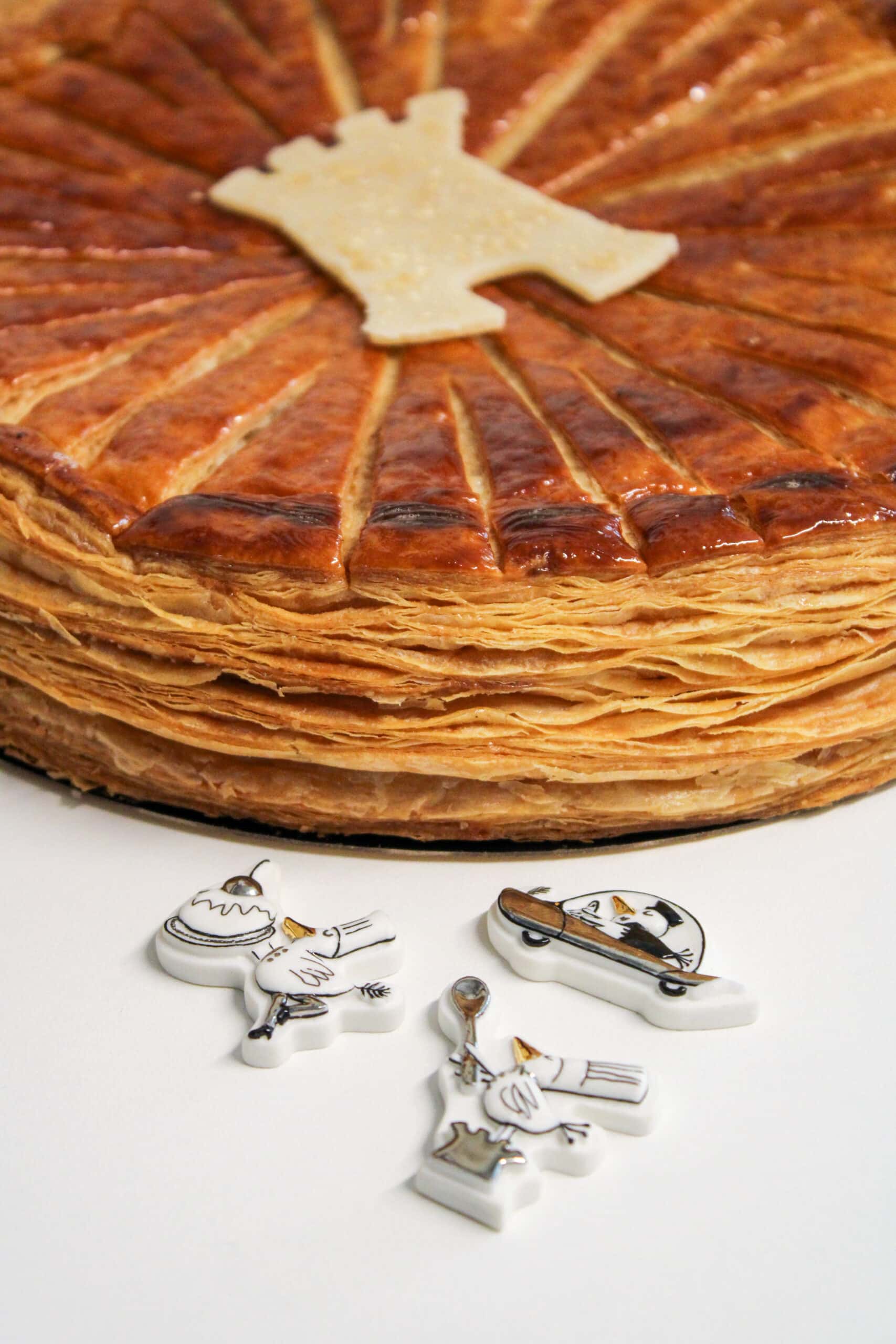 The frangipane galette from the Boulanger de La Tour remains true to tradition. Made with light and crispy all-butter puff pastry, it is filled with a delicate almond frangipane cream. The golden galette is also adorned with marzipan bearing the emblem of La Tour d’Argent. As every year, Vincent Boudgourd, the Maison’s illustrator, has exclusively designed porcelain figurines for this Epiphany. These little treasures pay homage to the craftsmanship of La Tour d’Argent, depicted through the iconic little duck of the Maison.