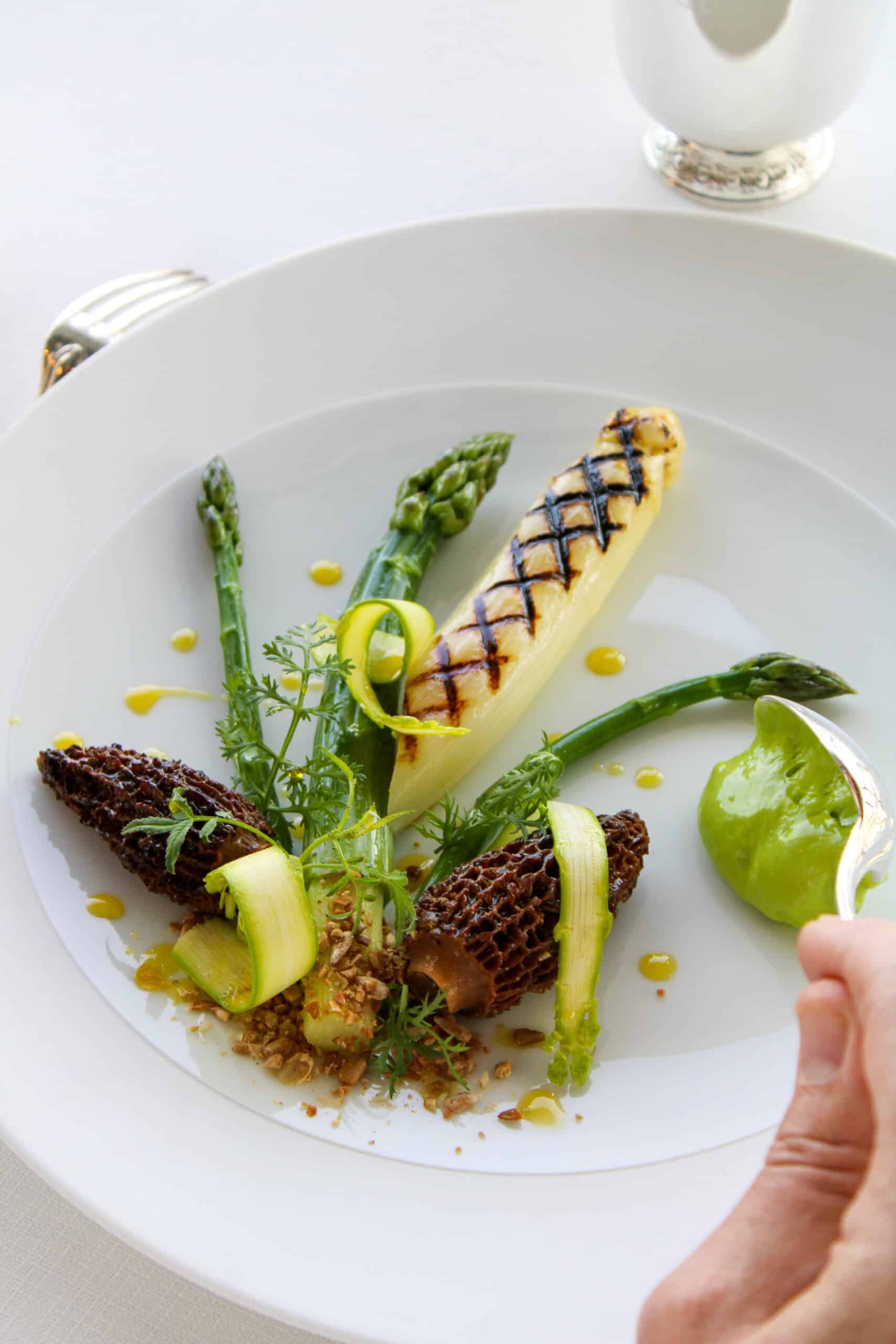 Création Une recette de saison ! Les asperges signent l’arrivée du printemps et font leur entrée à la carte : une Asperge blanche grillée, une Asperge verte rôtie au beurre, et une Asperge verte cuite à la vapeur, toutes sublimées par des morilles farcies au pralin de tournesol et un somptueux sabayon à l'ail des ours.