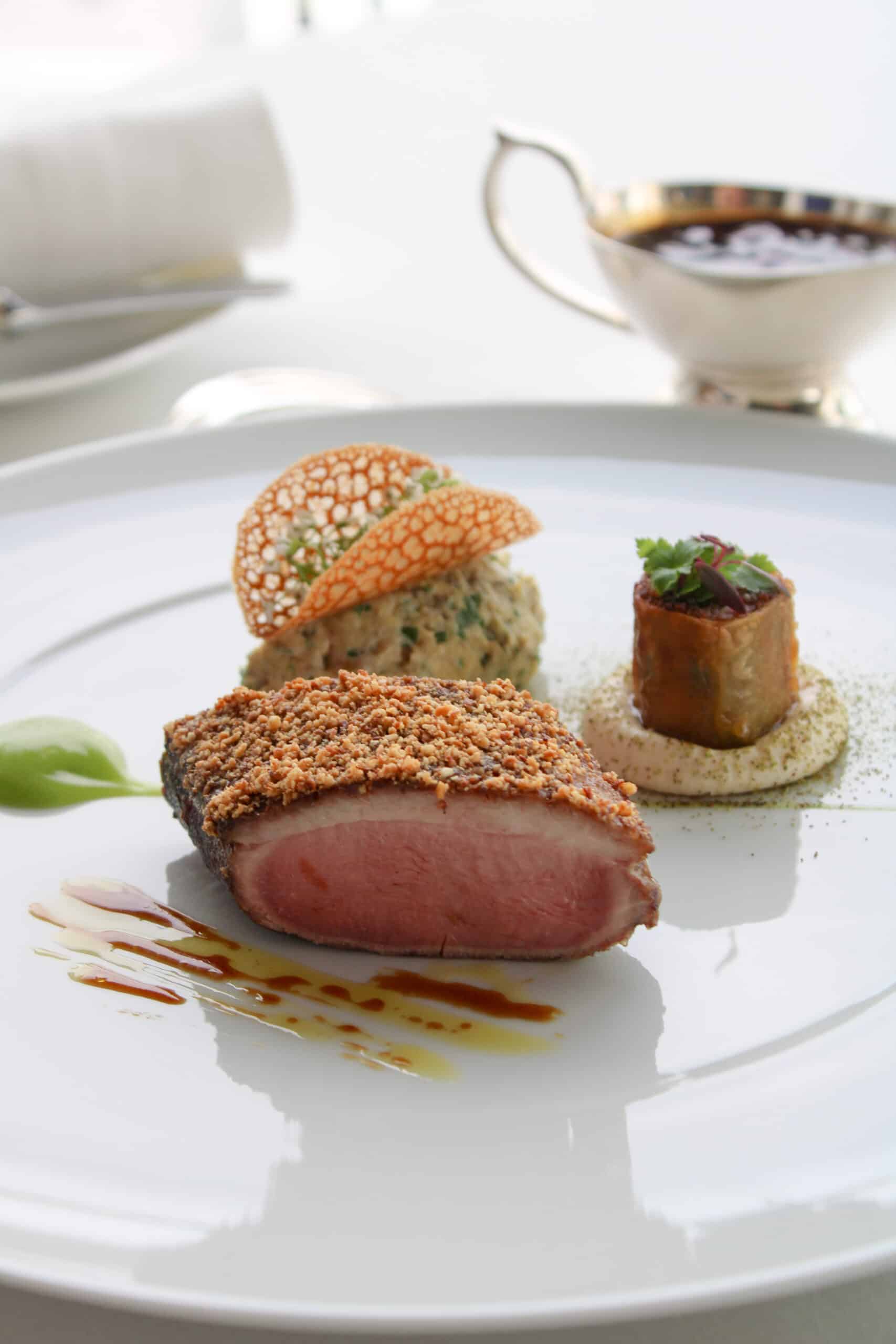 Discover the latest creation from our Chef Yannick Franques, the “Caneton au Fil du Temps”. A roasted duck breast from Maison Burgaud, delicately flavored with smoked almonds, accompanied by an eggplant caviar with Greek yogurt, a confit leg in pastilla-style stifado, all enhanced by a Corinth molasses jus. Ready to be seduced by this seasonal composition ?