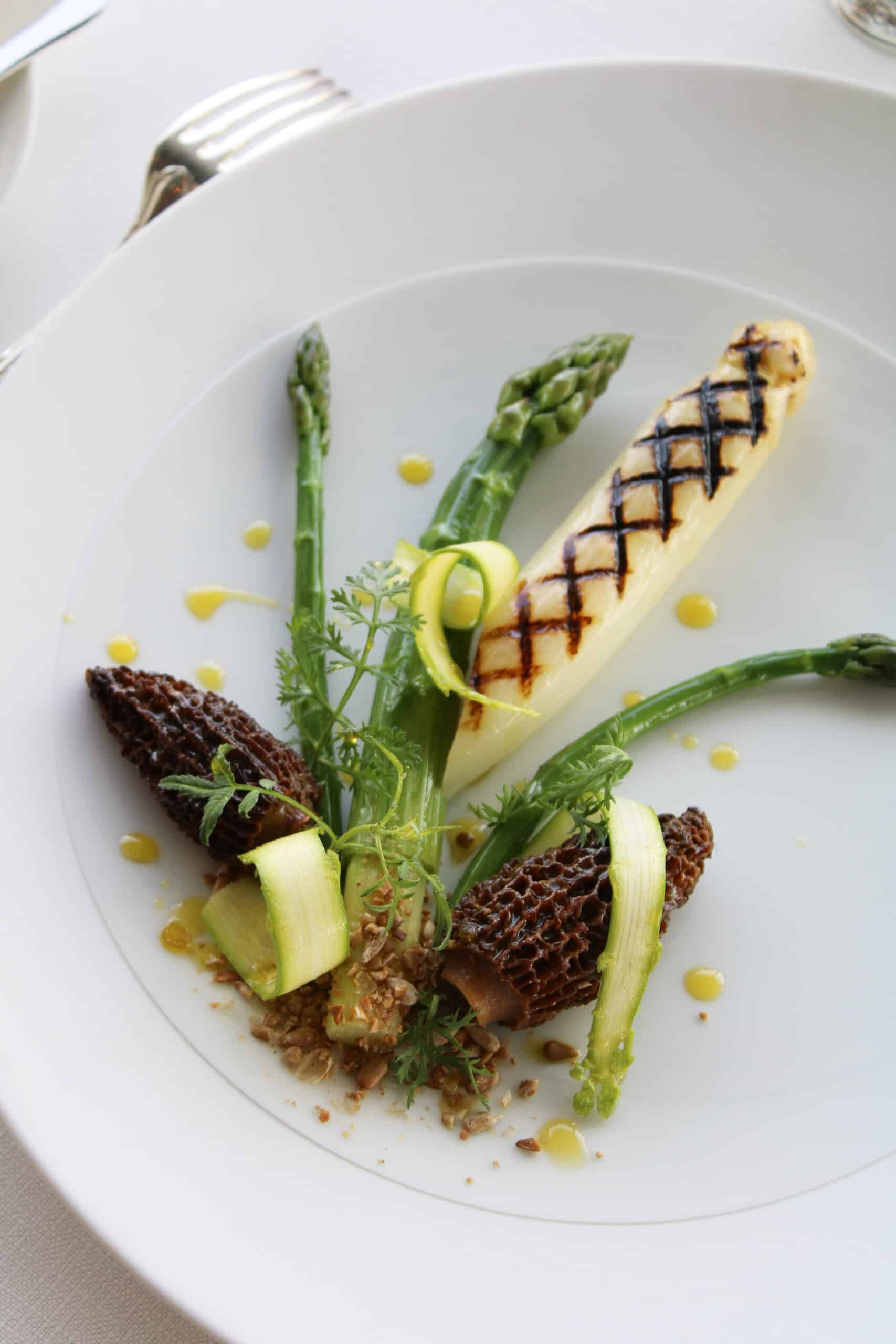 Asparagus herald the arrival of spring and make their debut on the menu: a grilled white asparagus, a butter-roasted green asparagus, and a steamed green asparagus, all enhanced by morels stuffed with sunflower praline and a sumptuous bear’s garlic sabayon.
