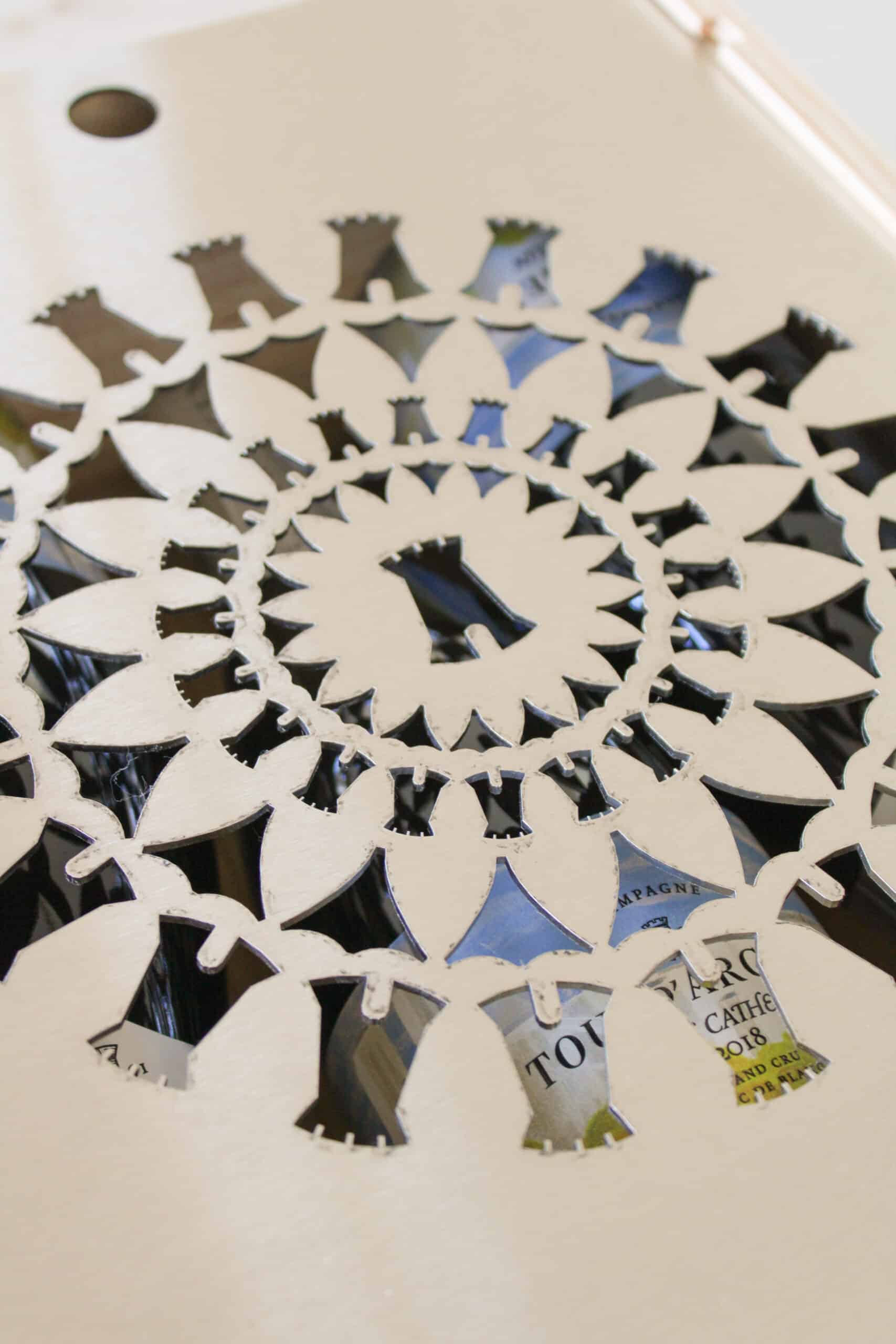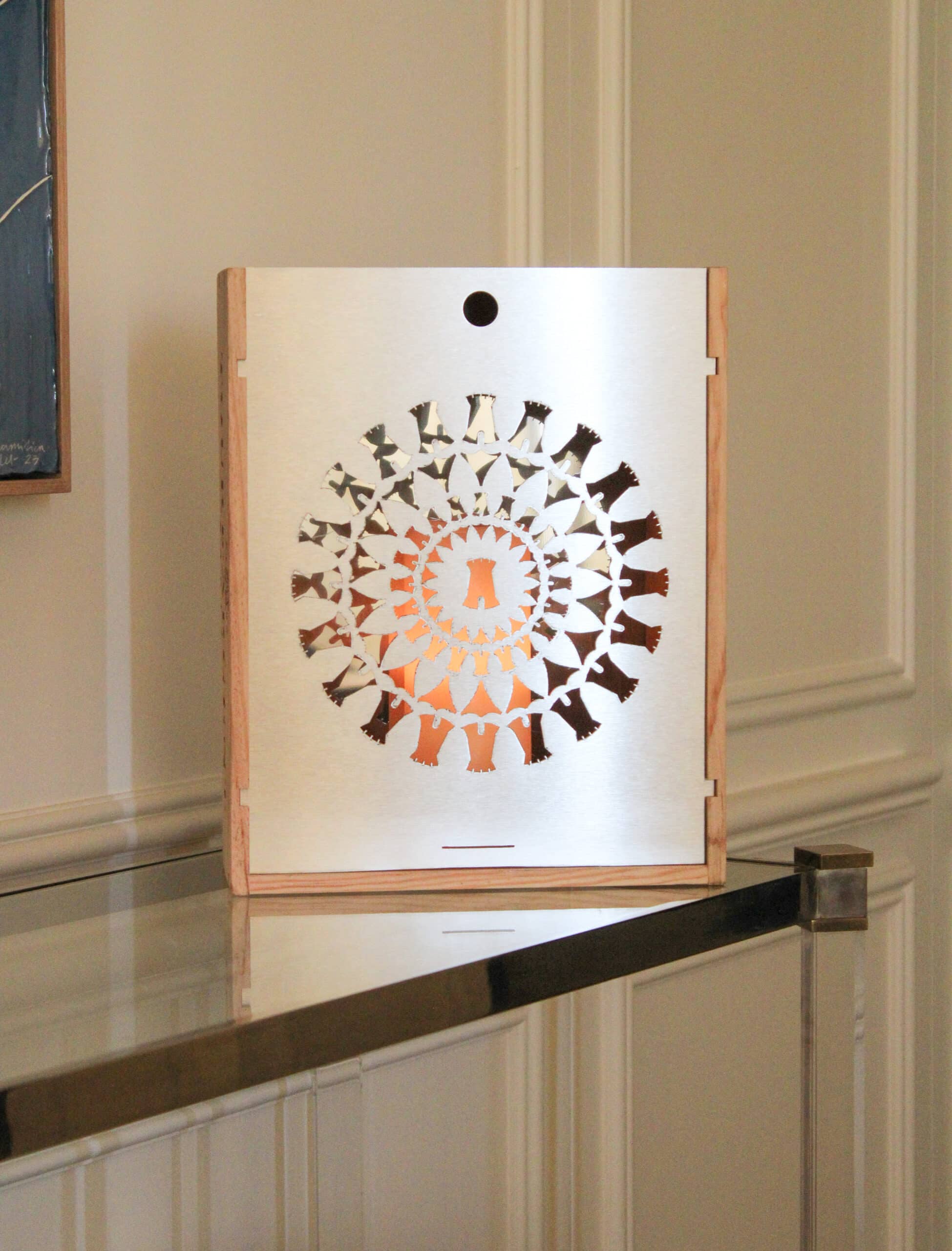 Le coffret, en bois avec un couvercle en métal finement sculpté, reproduit une rosace inspirée des vitraux de la cathédrale. Une fois vidé, il se transforme en photophore, projetant une lumière évoquant la magie des vitraux parisiens.