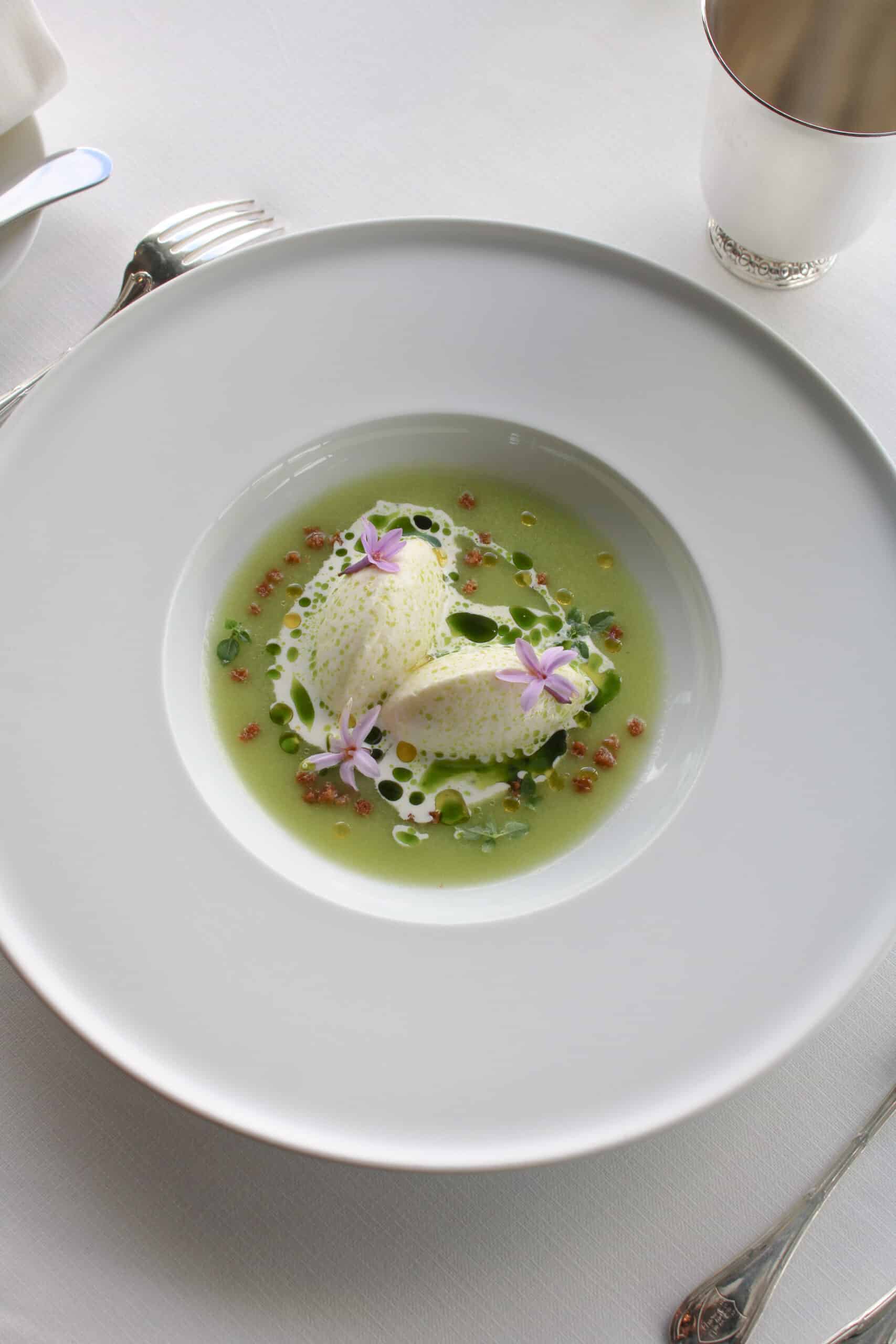 Le Chef Yannick Franques nous surprend une fois de plus avec une recette qui promet un instant d’exception à la table de la Tour d’Argent. Les quenelles de sandre nappées de burrata crémeuse à l’huile de basilic sur un velours de tomates Green Zébra.