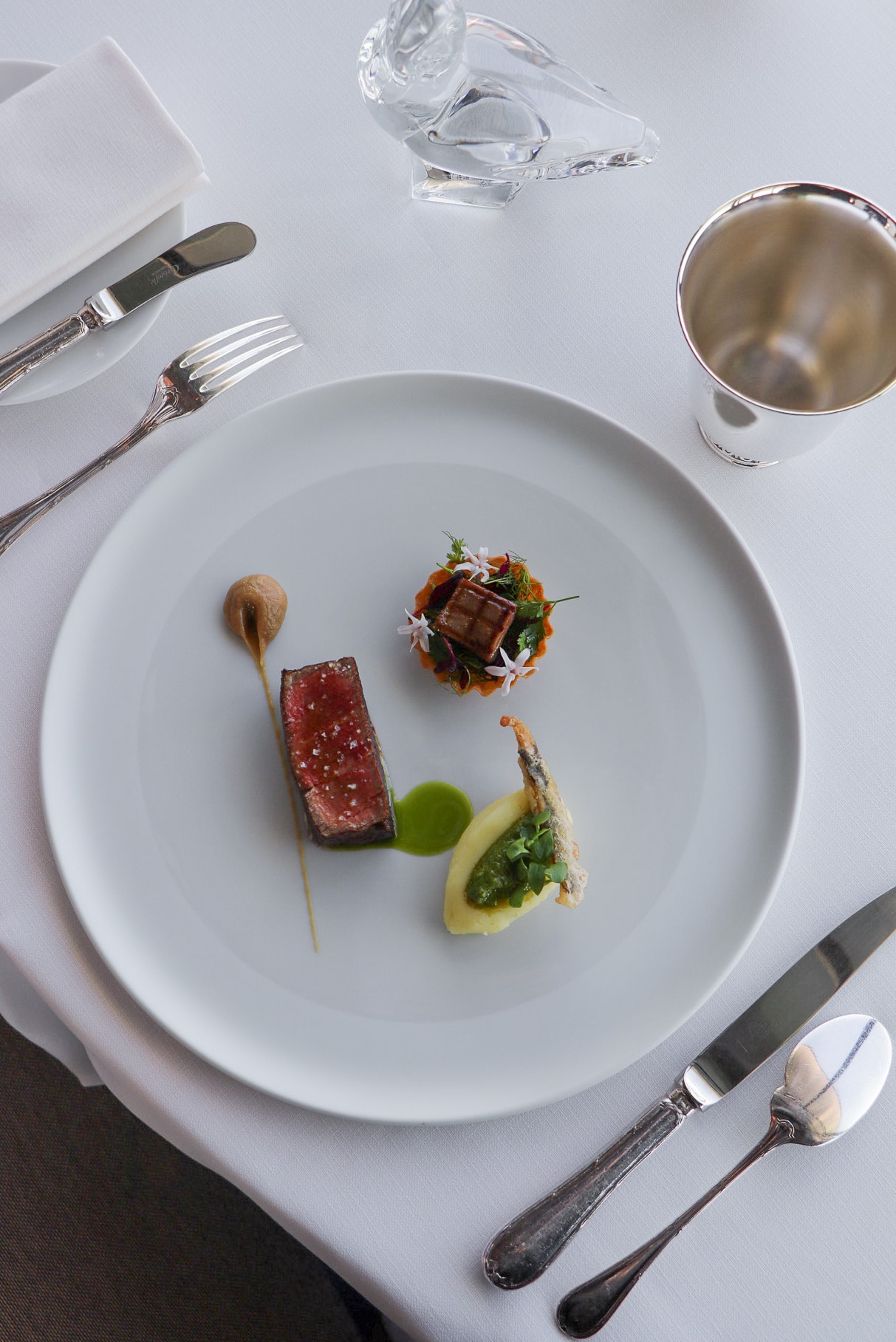 Le Chef Yannick Franques signe une assiette d’une grande finesse autour du bœuf fermier de l’Aubrac. Le filet est subtilement frotté au poivre de Phu Quoc, accompagné d’un pastrami de langue fumée grillée, d’une mousseline de pomme de terre au pistou, et d’un beignet d’anchois croustillant.