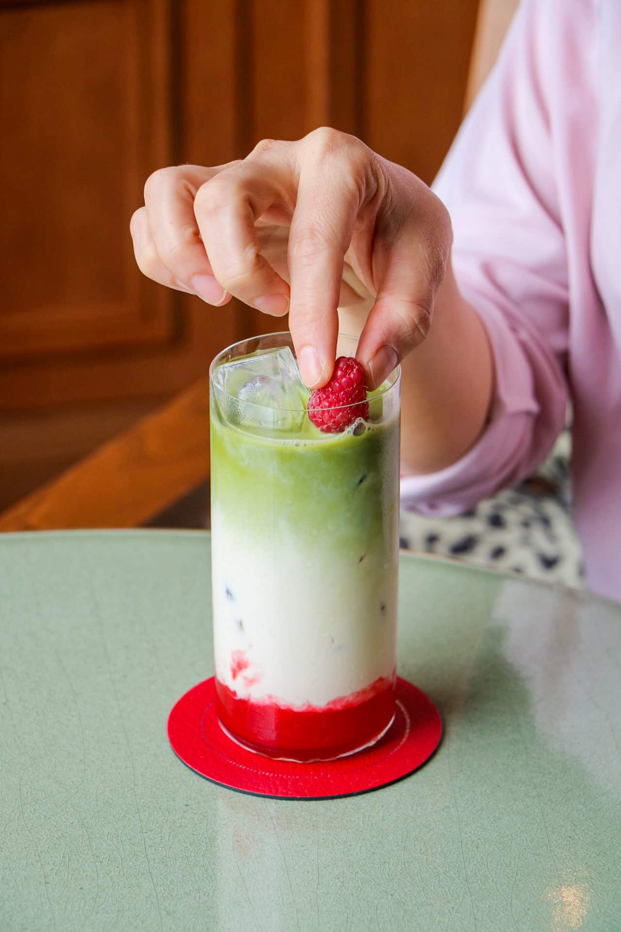 Dans l’écrin feutré du Bar des Maillets d’Argent, notre barista signe une nouvelle création inédite : un matcha latte glacé à la framboise et au citron vert, à savourer tout au long de la journée.